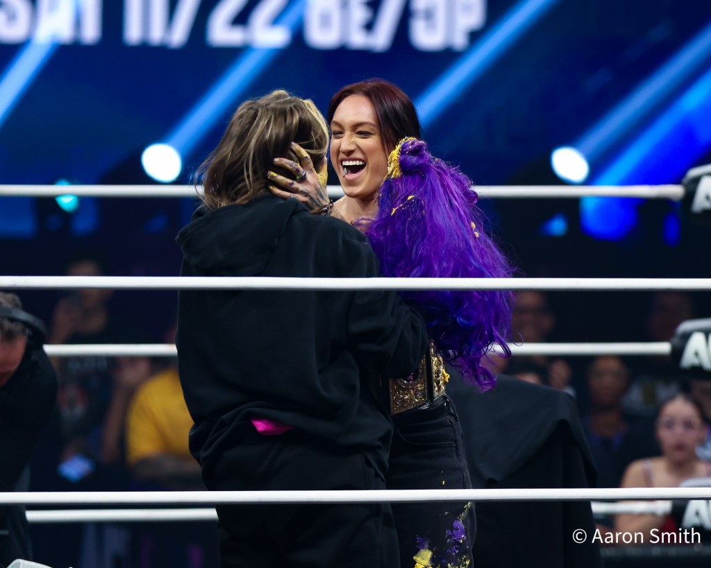 A cake celebration for Moné turned into a brawl when Statlander, disguised as a cameraman, attacked her. Moné later accepted Statlander’s Full Gear challenge.